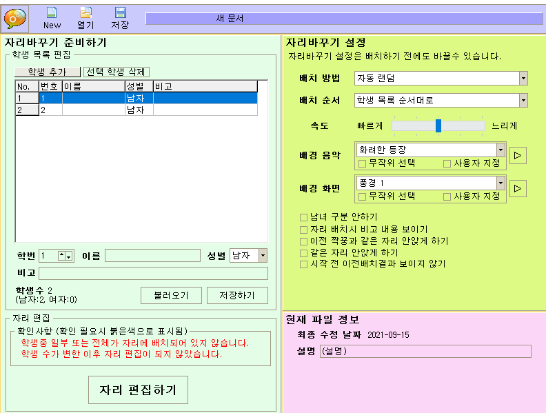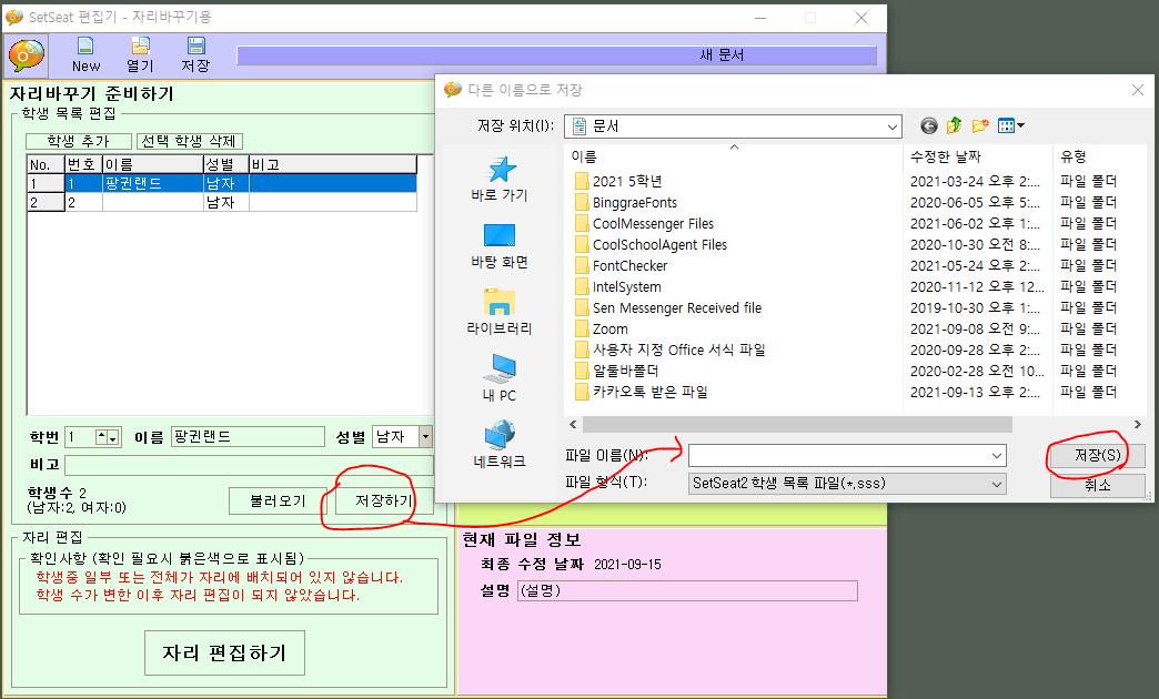 배치도구 - 자리바꾸기 - 자리바꾸기 파일열기 - 아까 저장한 9월자리.ssd 파일 열기