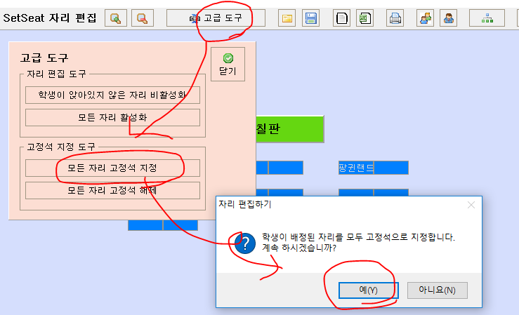고급도구 - 모든 자리 고정석 지정 - 예를 눌러주세요!